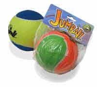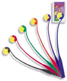 So what is good exercise? Those of you who have visited my kennel have watched my "Thundering Herd", and know exactly what good exercise is. I throw the tennis ball in the back yard, as hard and as far as I can, and all my dogs give chase. I keep it up until they start coming back slower. My "old man" Bud will go stick his whole head in the water bucket, a good sign that it's quitting time! That's good exercise. Usually takee 15-20 minutes twice a day for adult dogs. Exercise is important, but should be done with care with large breed puppies. For the first 4 months playtime should happen 3-5 times a day. Some easy fetching, some gentle rough and tumble, some gentle tug of war. Respect his energy level. When he tires, don't push. Babies still need lots of sleep. From 4-12 months, running, fetching, and if you can, swimming is especially good. If you have water access, swimming (throw the ball in the pool) is great. It's a smooth motion low impact exercise, good for both muscle tone and heart/lung (aerobic) exercise. Jogging is the next best. Start slow and short with a 4 month old puppy. He shouldn't go more than 1-2 minutes at a time in the beginning, walking and playing between sessions. Keep it fun for both of you. Slowly work up to times and distances he is comfortable with, and when he's a year old it'll be you that stops first. Playing fetch is a natural to most of these puppies, just take it easy, don't throw hard and far, and again keep the sessions short and playful and as mellow as possible reducing the hard stop and start, high impact exersize. And always remember with the little ones, they are still babies! Don't over do it. During this period you need to be alert for lameness, soreness in elbows, shoulders or even hips. Because these large dogs grow so fast, they can get uneven growth or damage to the soft growing layer of bone in the joints. Too vigorous exercise with sudden stops and starts can cause this damage, so use care. If it is a case of bruising the growth plate, reduced exercise and an antiflammatory (like aspirin) for a week or to may cure it. If not, then surgery ($$$$$) will be required. He will need the exercise, just be careful. Lameness, or limping for no obvious reason (like he got his toes stepped on), indicates a trip to the vet is in order. After 12 months or so this should no longer be an issue. Here are some suggestions for throw toys other than your standard tennis ball. (Click on image. Opens in new window. Close to return.)